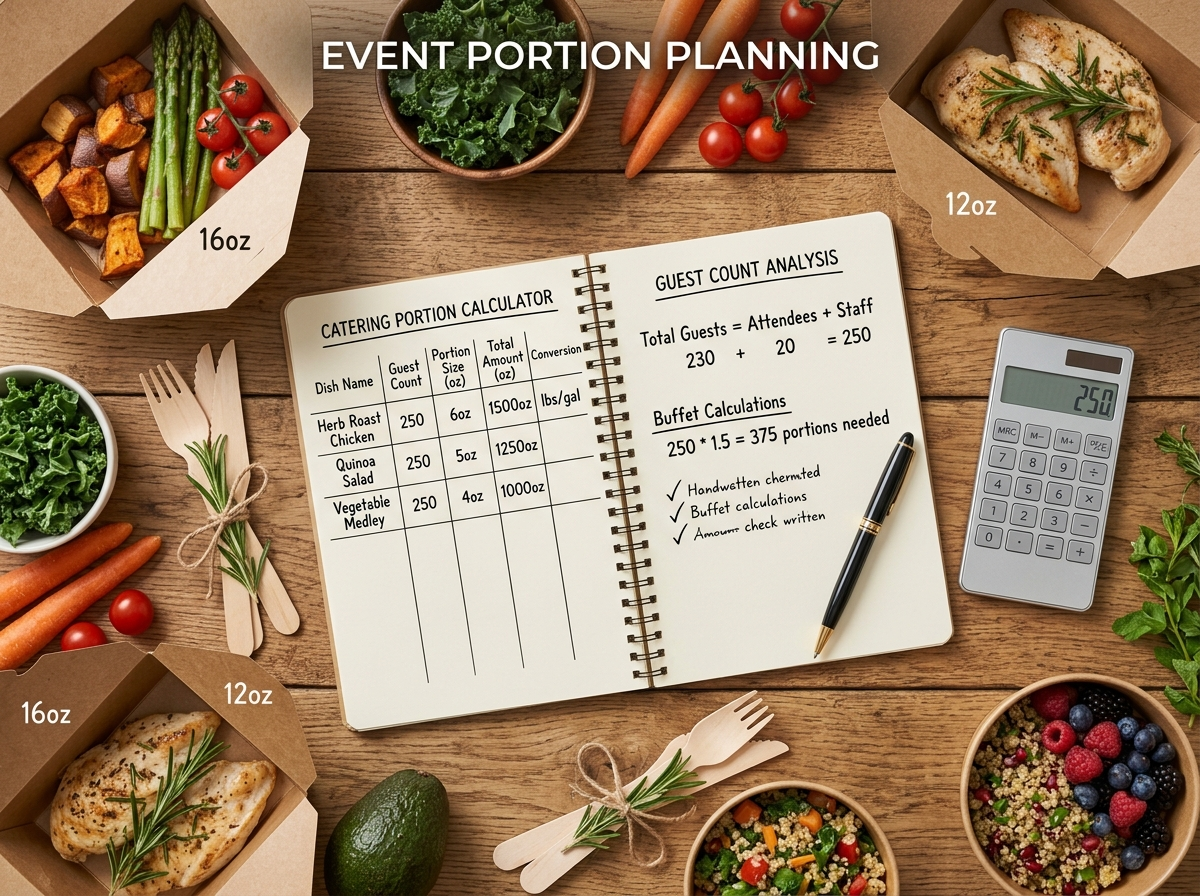 For cocktail receptions, use 8oz bagasse containers for individual portions. Lunch events work well with 12oz kraft containers for main courses. Dinner events need 16oz bagasse containers to accommodate full portions with proper headspace.