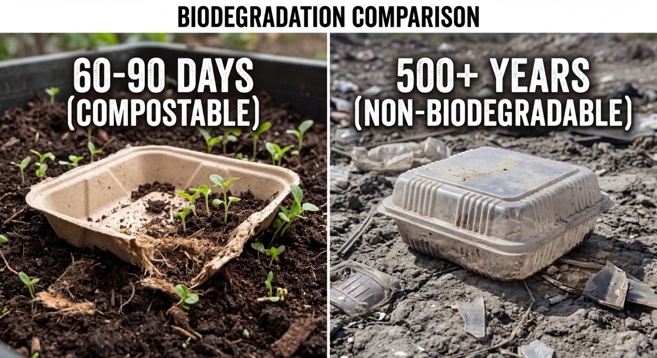 Yes, and that's the whole point. According to EN 13432 testing standards, bagasse fully breaks down within 45-90 days in industrial composting and 60-120 days in home composting. This is a huge advantage - it returns to the soil as compost instead of sitting around for centuries like plastic.